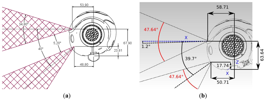 By using pixel-angle conversion it is possible to estimate the correct distance to non-centered features. The aperture of the lens, in both horizontal and vertical axis, and the image resolution, characterize this conversion. Unlike the intrinsic case, this correction must be applied separately from the top and bottom camera, as there are no two identical lenses.
