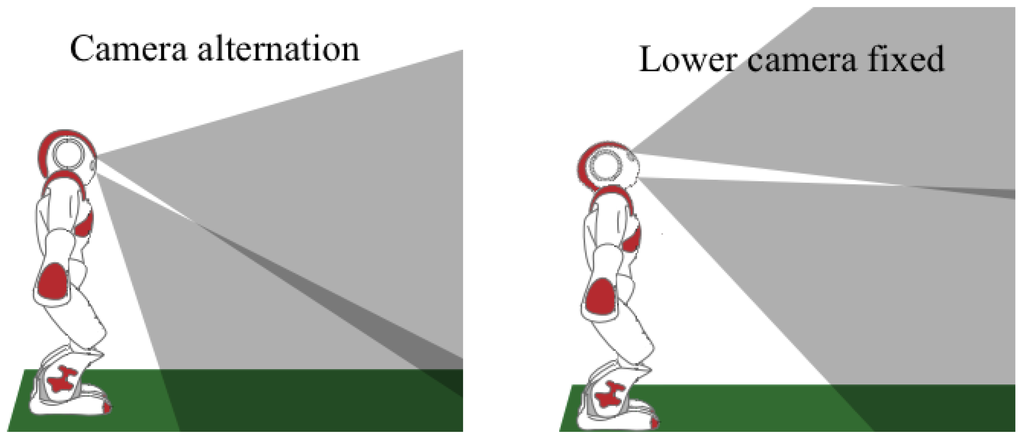 For this purpose, three operating modes are introduced: upper camera fixed; lower camera fixed; and camera alternation. The first mode (upper camera fixed) is usually the least used mode due to its activation conditions and its effective range limitations. This mode will only be used in those cases where the ball or other relevant object is situated several meters from the robot and it must be tracked. The second mode (lower camera fixed), in contrast with the previous mode, is the mode most often used during the match. This mode must be active when the robot tracks an object situated near the robot. The third mode (camera alternation) is activated when a scan of the environment must be made and the limits of the game field do not appear in the FOV of the lower camera, as illustrated in Figure 4. This third mode is also used when a shot-to-goal must be made and the ball cannot be framed with the goal in the same picture. By using this alternation, a considerable amount of unnecessary head movements are saved and more information is obtained per cycle.