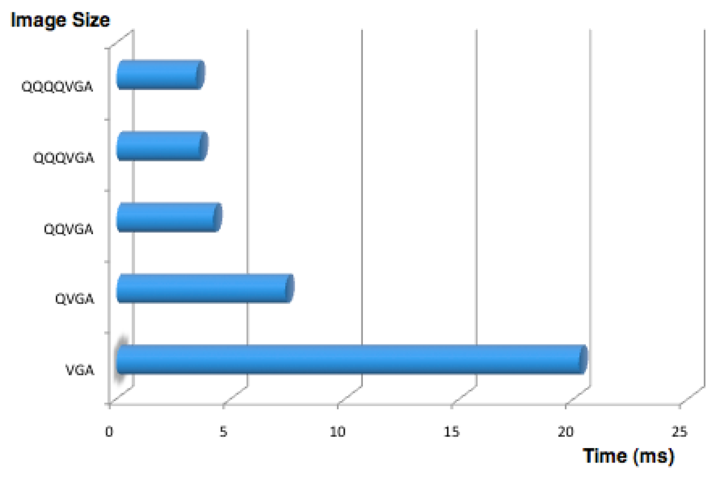 Once a frame is captured, the contained information must be extracted. The first step is to perform the segmentation process by colors. A look up table (LUT) is used for this purpose, which has previously been configured using the H-Manager application for the definition of the range of values that match each color. This process has a high computational cost, as it must examine each image pixel and determine its color. To lower these costs, a subsampling method known as scanlines was implemented as described in [18]. This technique avoids processing the whole image by skipping certain pixels, and so produces the same cost as would be obtained by processing a low-resolution version of the picture. Thus, the number of skipped pixels in this process is strictly related with the computational costs as shown in Figure 6. However, skipping pixels increases the difficulty of finding a feature in the image. If the number of ignored pixels is too high, some information may be missed. To preventing this problem arising, a system for managing the subsampling method was implemented.