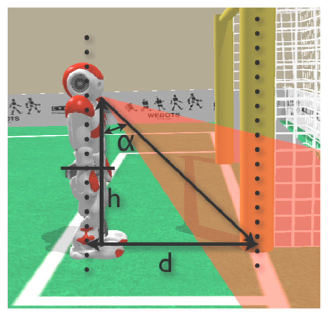For computing the correct relations, a two-step adjustment process of the camera has been proposed in this paper. The first step deals with the intrinsic adjustment to compensate for lens distortion, while the second step performs an extrinsic adjustment based on the position of the camera. Finally, by a simple triangulation involving the real angle between the camera and the vertical axis of the robot and its height, the real distance can be estimated as illustrated in Figure 8.