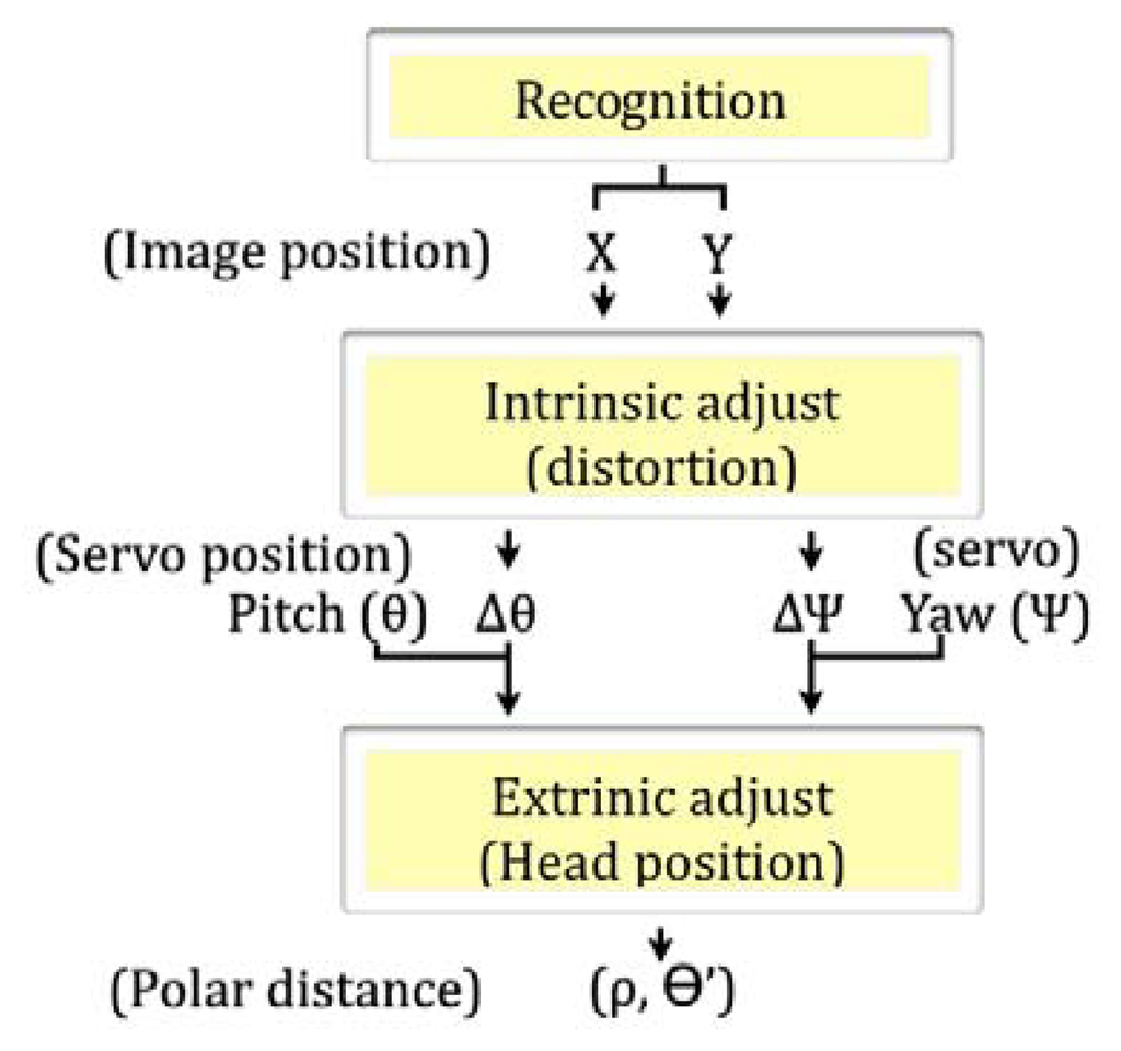 Once the camera has been adjusted through this process, the distance between the robot and the object of interest can be obtained, expressed in its polar form, and starting from the visual information. The whole process is represented step by step in Figure 9.