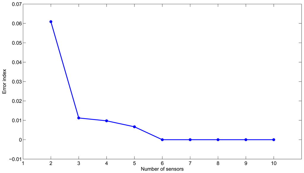 In order to select the adequate configuration of sensors, we propose performing the experiments described above and look for the combination with the smallest average error index along all the possible leak magnitudes and sensitivities to test. This criterion is analytically established by taking the minimum of the average error indices: