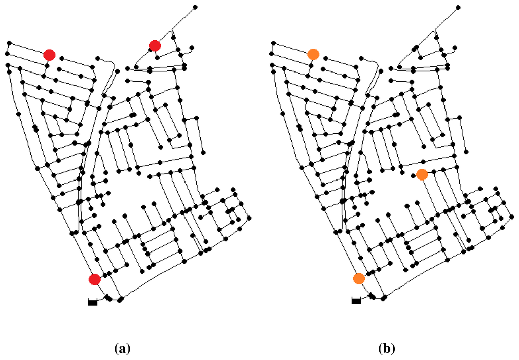 After the iterations, the best result obtained corresponds to a sensor configuration of nodes {2, 75, 158}, with an error index of 0.302, which means an average distance of two nodes between the located node and that with the real leak. This placement is shown in Figure 3a.