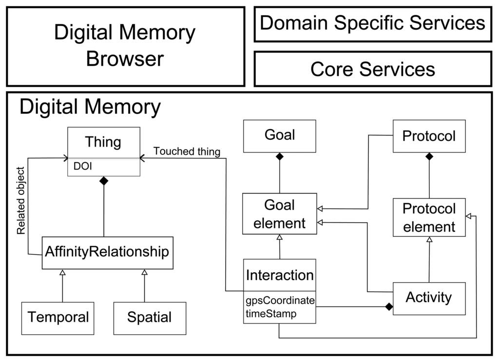 The core element of our approach, as seen at the bottom of Figure 1, is the Digital Memory concepts. Dig-Mem stores structured information about the interactions of persons with tagged things, and affinities between objects calculated from the interactions. These affinities represent relationships between the objects in the environment. The interactions are grouped into activities, following some rules defined by the user. A user can also define goals or protocols over the activities and interactions.