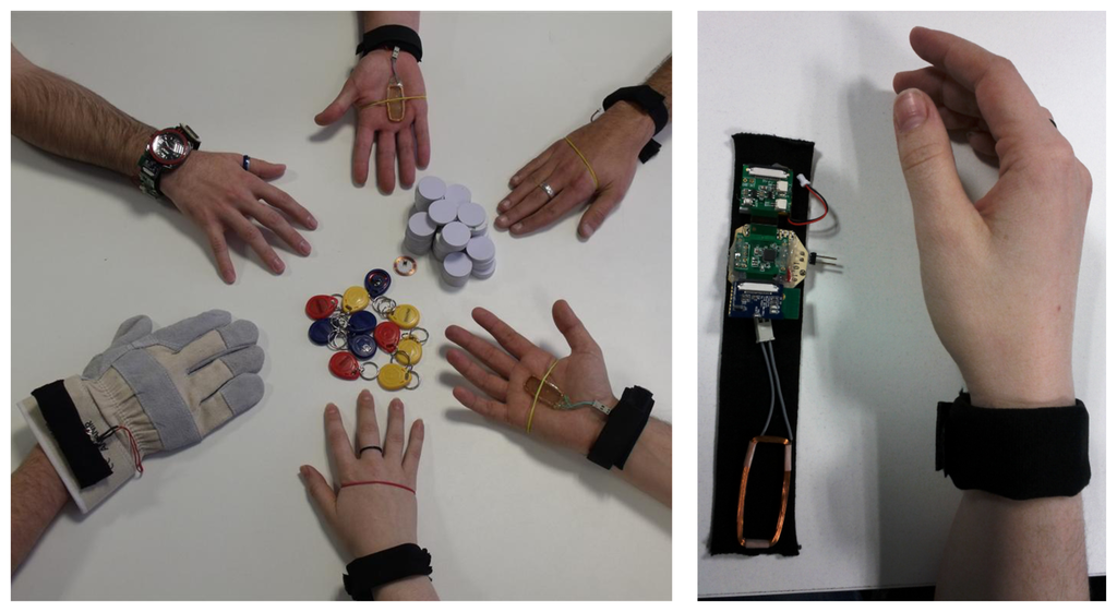 Figure 2. Different prototypes of our RFID Tag reader, such as a glove, a bracelet and a watch (left). The final prototype used in our evaluations (right).