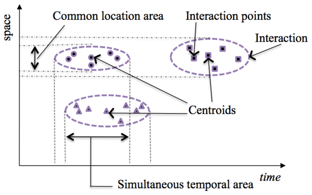 Finally, the intersection of the temporal or spatial extensions of the cluster can lead to the establishment of affinities between different Interactions. The system can determine the degree of spatial affinity between two interactions based on the existence of a common location area for the clusters. To calculate the spatial span of the cluster, we use the location of the centroid plus the common location area (See Figure 3). The system can similarly determine the degree of temporal affinity between two interactions based on the existence of a simultaneous temporal interval for the clusters. To calculate the temporal span of the cluster, we use the temporal coordinate of the centroid plus the temporal extension of the cluster as calculated by clustering analysis.