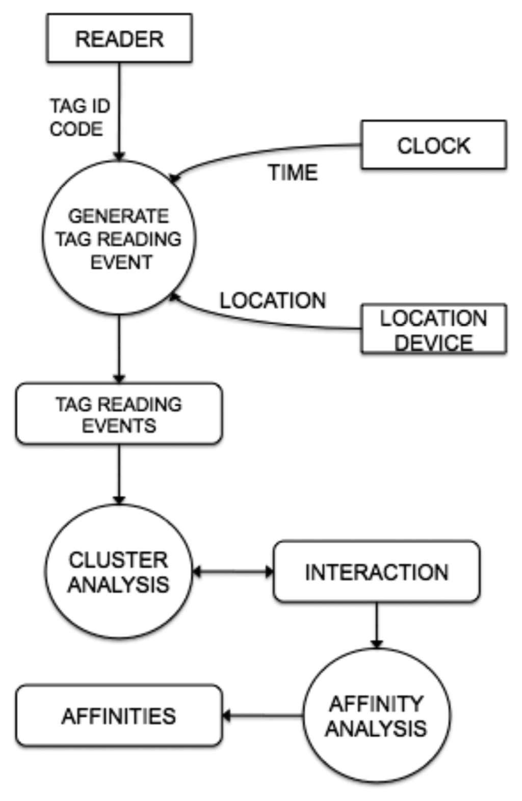 An example of the steps performed by the system to generate interactions and affinities is shown in Figure 4. The RFID-reader reads an electromagnetic tag and sends its DOI to the Generate Tag Reading Event step. This step obtains the time and location from the smart phone clock and GPS receiver and packs all these data as a Interaction Point that is stored in the smart phone. Step Cluster Analysis reads the new Interaction Point and looks for an interaction where the Interaction Point is near to its centroid, based on distance. If the interaction is found, its centroid, duration and spatial extension are updated. If no interaction is found, a new one is created with the Interaction Point as centroid and zero value for temporal and spatial extensions. Step Affinity Analysis reads new interactions and searches for affinities. If an existing affinity is found, its frequency counts are updated. If a new affinity is found, it is created with value one for its frequency counts, and stored in the smartphone.
