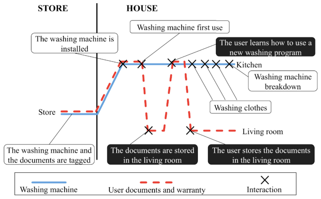 Figure 5 shows when the date of arrival of the appliance at home was recorded (our first interaction with the thing). The difference between that date and the current date, will produce the needed information about the warranty expiration. We can also observe that the washing machine and the documentation stay together while the appliance is in the store but when it arrives at the user house their locations split up. While the washing machine is installed in the kitchen the documents are stored in other room; the user Dig-Mem will record both locations. The documents location is going to change each time the user gets them to learn how to use a new washing program. The user Dig-Mem also remember each time the user utilizes the washing machine.