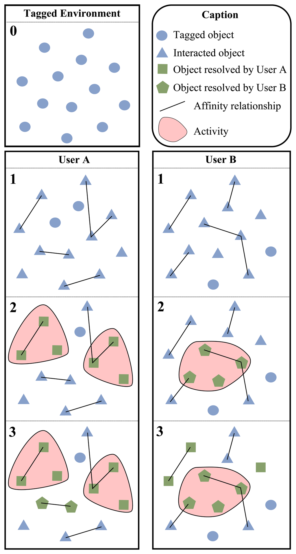 Each blue circle represents a tagged object. Users start using the Dig-Mem and, after some interactions, affinity relationships are established among the objects (see block 1). Blue triangles represents objects that the user has interacted with, lines represents affinities among objects. We can see that interactions and affinities are not the same for both users. Then (see block 2) User A has declared two activities, indicated by red shapes, involving some of these objects. As part of the activity declaration process he has resolved the names of the objects with its DOI, now these objects are represented by green squares. To do so, the user is aided by an assistant included into the smartphone. The user can resolve a name for a DOI whenever he wants, by means of the browser. Furthermore, when the user interacts several times with a non-resolved object the assistant will ask for a name. User B has declared only one activity and his resolved objects are represented by green pentagons. At this moment the names used by the users for those specific objects are uploaded anonymously to a cloud. The next time that users interact with a non-resolved object, the name used by other users will be proposed. Finally (see block 3) we can see two objects, represented by green pentagons, have been resolved for User A using the names of user B. As for User B, he has three objects, represented by green squares, resolved thanks to the names of User A.