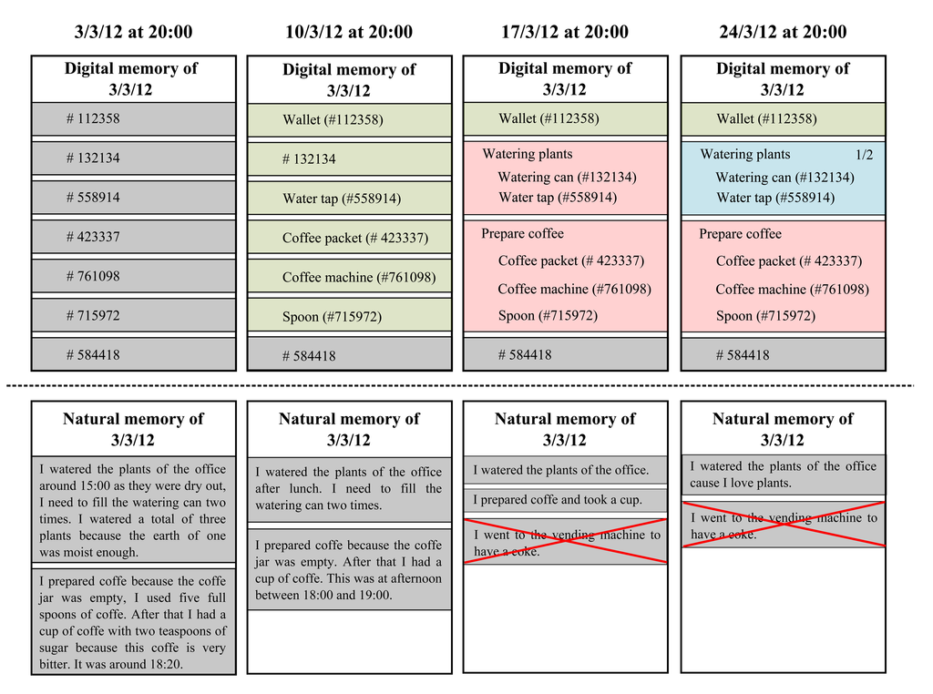 In the first meeting, the Dig-Mem is just a set of interactions. There are no objects resolved so we can't figure which element represents each DOI. These memories can't be interpreted only looking at the Browser (although we can use them trough core services). By contrast, natural memory has plenty of details. We can watch how the intern remembers that he has watered the plants, but also details as the number of times they filled the watering can or why they decided to perform the action. With the coffee we observe the same; it offers plenty of details, such as the number of spoons and even personal assessments about the action.