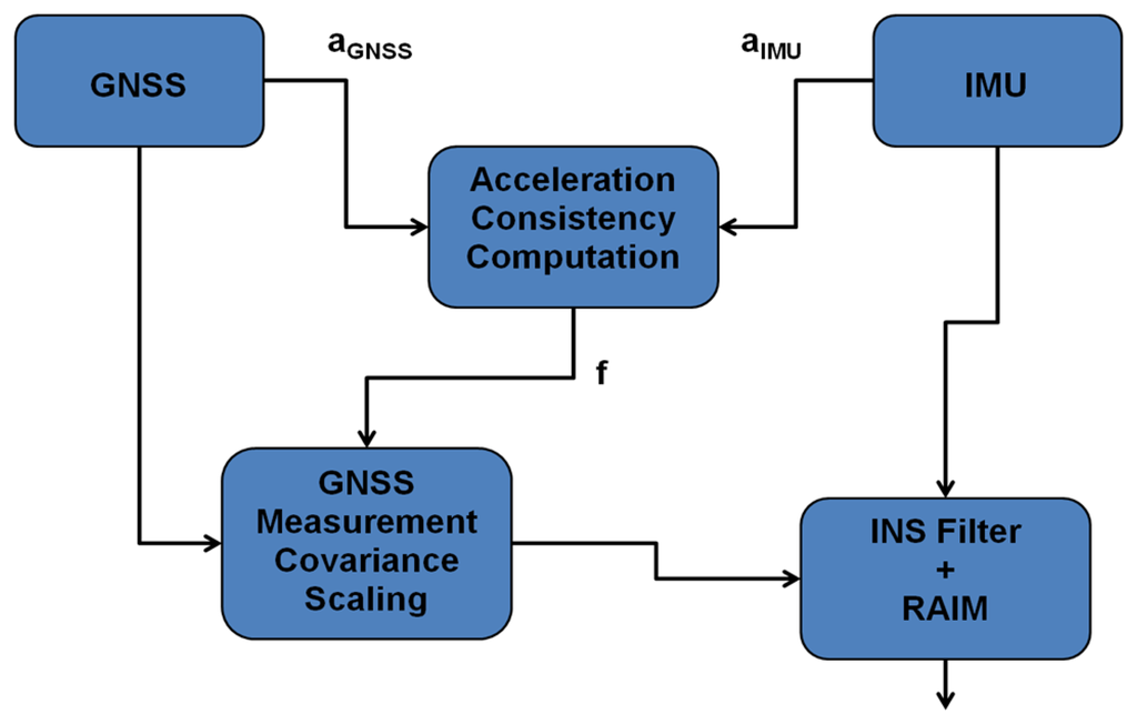 : In natural and urban canyon environments, Global Navigation Satellite System (GNSS) signals suffer from various challenges such as signal multipath, limited or lack of signal availability and poor geometry. Inertial sensors are often employed to improve the solution continuity under poor GNSS signal quality and availability conditions. Various fault detection schemes have been proposed in the literature to detect and remove biased GNSS measurements to obtain a more reliable navigation solution. However, many of these methods are found to be sub-optimal and often lead to unavailability of reliability measures, mostly because of the improper characterization of the measurement errors. A robust filtering architecture is thus proposed which assumes a heavy-tailed distribution for the measurement errors. Moreover, the proposed filter is capable of adapting to the changing GNSS signal conditions such as when moving from open sky conditions to deep canyons. Results obtained by processing data collected in various GNSS challenged environments show that the proposed scheme provides a robust navigation solution without having to excessively reject usable measurements. The tests reported herein show improvements of nearly 15% and 80% for position accuracy and reliability, respectively, when applying the above approach.1. Introduction