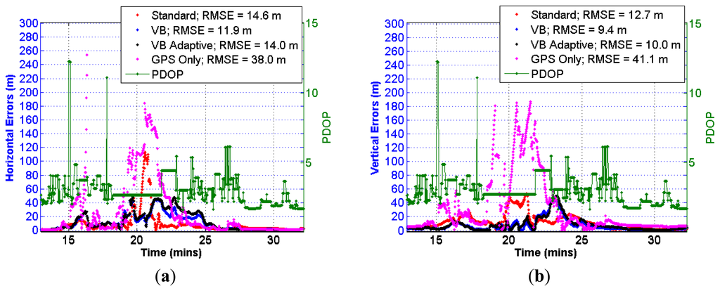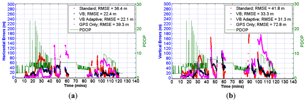 To assess the performance of the proposed scheme in such environment, a standard tightly coupled GNSS/INS filter with residual based FDE was first implemented whereby the GNSS range and Doppler measurement errors were assumed to follow a normal distribution. The GNSS measurement distribution was then replaced by the t distribution thus transitioning the navigation filter to a VB filter. Finally, the variance adaptive scheme discussed in Section 2.2 was also implemented along with the VB filter. These three cases are termed as: (i) Standard; (ii) VB and (iii) VB Adaptive, respectively. Since C/No based weighting has been found to be more robust in harsh GNSS signal conditions, the Sigma-ε variance model discussed by [13] was used to scale the GNSS range and Doppler measurements in all three cases. The performances of these three filters were first inter-compared by computing absolute values of horizontal and vertical errors. These horizontal and vertical errors are plotted only for the portion of the data in which the GNSS conditions were very harsh and the errors were more severe as depicted in Figure 10a,b. However, it is noted that the error values can grow very large corresponding to the times for which the satellite geometry was very poor as indicated by the dilution of precision. Thus, to segregate the effect of biased and diffused measurements from that of poor satellite geometry, the errors statistics were computed only for the times in which the position dilution of precision (PDOP) values were less than or equal to 10. The effect of masking in the urban environment is clearly depicted by the high PDOP values plotted alongside the errors in Figure 10a,b. Moreover, the portion of the data in which the user was static in a relatively open sky condition with many line of sight (LOS) GNSS measurements was also discarded in order to confine the analysis to degraded environments.