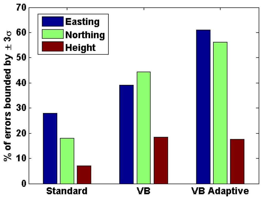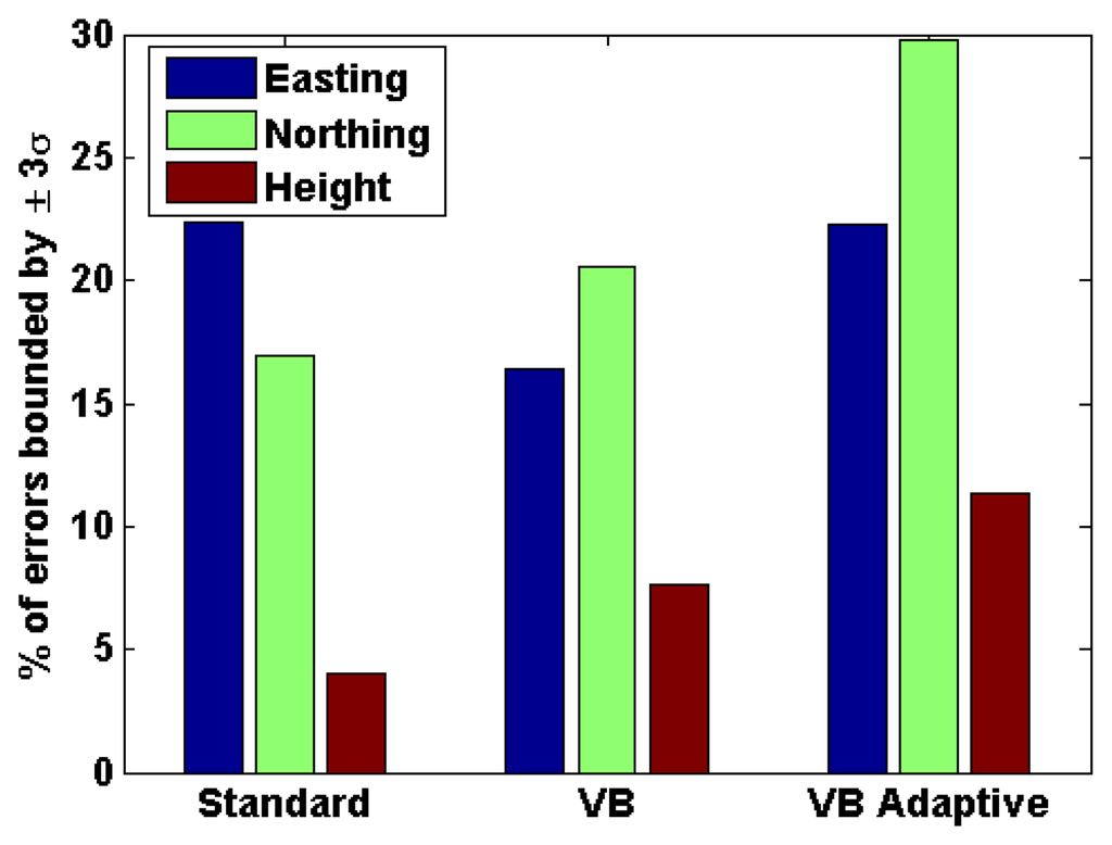 As discussed in Section 1, one of the most critical parameters for many applications using personal navigation devices is the reliability of the navigation solution. In this regard, the reliability of the navigation solution along the axes of the local plane for the three cases discussed above were computed as shown in Figure 11. It is observed that the reliability values are low for the standard filter. This is a common problem with standard Kalman filters, especially in integrated systems like GPS/INS, wherein the estimated accuracy of the navigation solution is often optimistic. However, the reliability values are found to improve with the VB filter and even further with the adaptive VB filter thus mitigating the problem of standard Kalman filters. These reliability results further indicate that, among the three filters, the adaptive VB filter best characterizes the true GNSS noise characteristics.