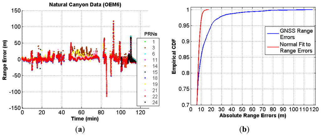 Moreover, a cumulative density function (CDF) of absolute values of the range errors was also plotted along with the CDF of absolute values of the normal fit to the range errors. It can be observed in Figure 12b that there are not only errors with significant magnitude but there is also a high non-conformity between the two CDFs. This indicates that assuming a normal distribution for such errors is likely to lead to a sub-optimal navigation solution.