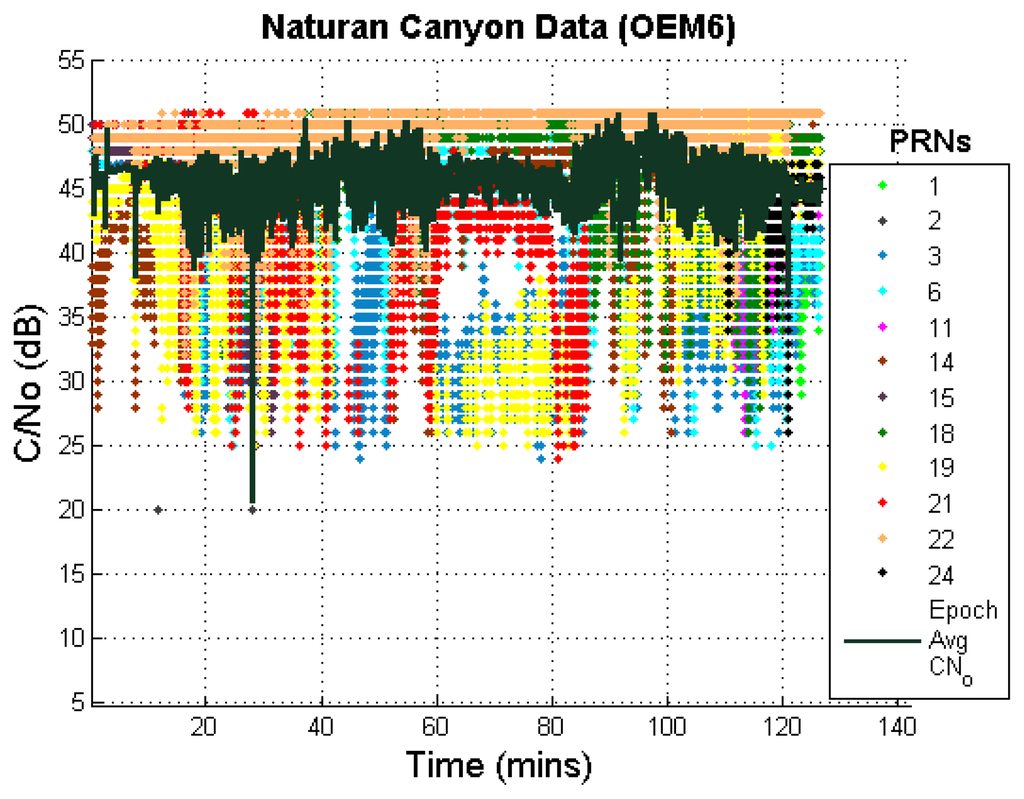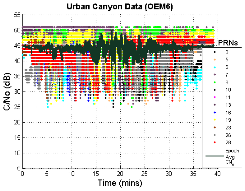 Additionally, the carrier to noise ratios (C/No) of available GNSS measurements are plotted in Figure 9 and show low values for many measurements in the middle section of the test duration. Such low values will result in higher measurement noise. This further shows the limitations of signal conditions in the test environment.