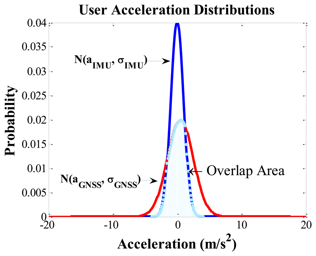 Improper handling of faulty measurements can result in an unreliable navigation solution. Reliability is the level of trust that can be placed on the navigation solution provided by a personal navigation device. For example, if a navigation system estimates a position with accuracy (1σ) of 2 m along a particular axis, then it means that the error along that axis is expected to be less than 6 m with a confidence of 99.7% (i.e., 3σ along that axis). However, if the true position along that axis is 10 m away from the estimated position, then the navigation solution is considered unreliable. Hence, a reliable navigation solution should have good consistency between the navigation solution and the estimated accuracy. Thus, in the context of this paper, reliability is defined as the capability of the navigation system to give a solution with proper accuracy and is formulated as the percentage of errors bounded by ±3σ or 99.7% (three times the estimated standard deviation of the position solution along a particular axis envelope).