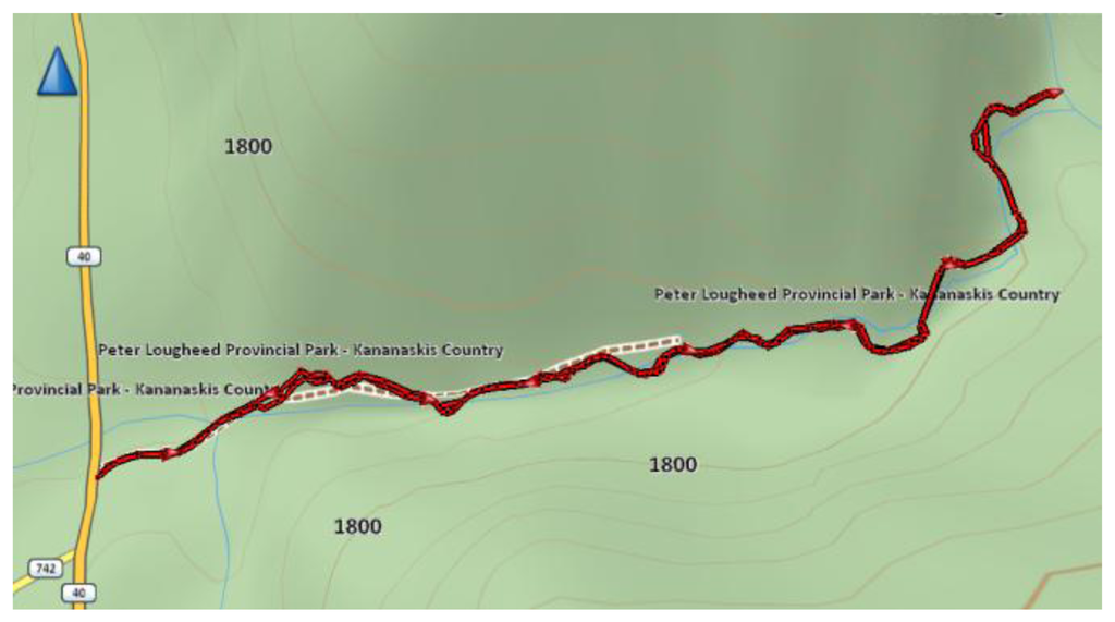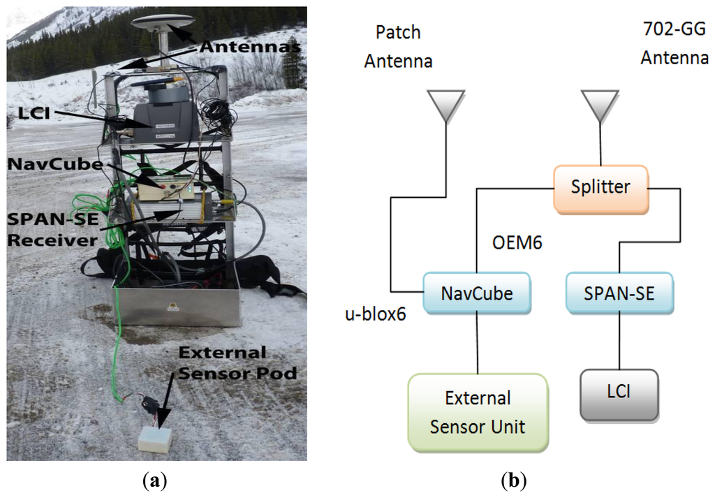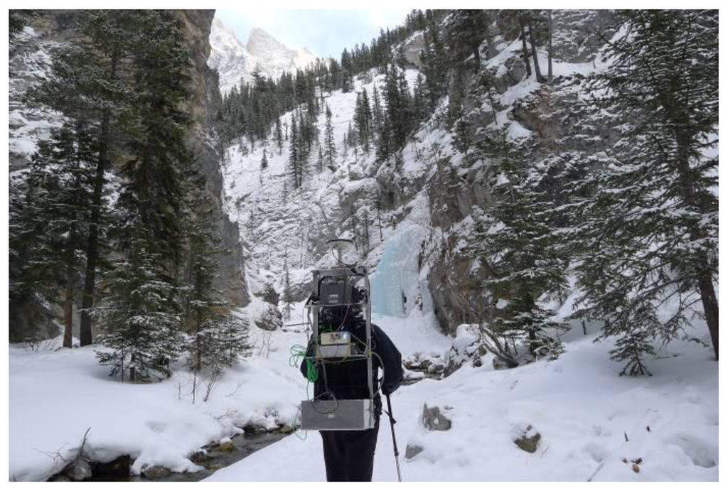 Unlike urban canyons where multipath is more specular, the multipath in natural canyons is generally more diffuse. The variation in the type of multipath while still limiting geometry and availability provides a unique test of the algorithms presented herein. Using a similar equipment setup as the urban scenario, data was thus collected in a natural canyon (King's Creek Canyon) in Kananaskis Country, AB, Canada. GNSS data collected using two receivers, namely OEM6 and u-blox6, were separately integrated with the IMU data collected using the ADIS16488 sensor unit. The test environment is shown in Figure 6.