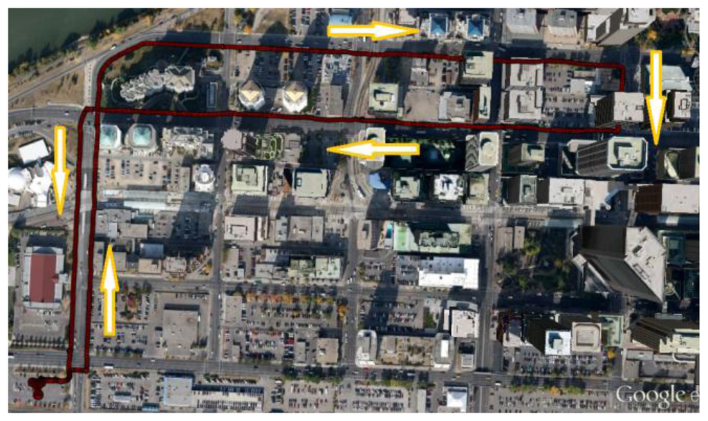 The canyon created by the presence of tall buildings in either side of a street makes the navigation very challenging, especially for navigation systems with GNSS as a major component. The presence of multiple NLOS multipath signals with significant biases and limited visibility of the satellites degrades the quality and availability of the GNSS measurements. Hence, in order to assess the proposed scheme in GNSS challenged environments, pedestrian data was collected in downtown Calgary, Canada. The test environment presented an elevation mask angle varying from about 15 to 75 degrees. The test duration lasted over 40 min. The reference solution obtained for the urban canyon test is shown in Figure 5.