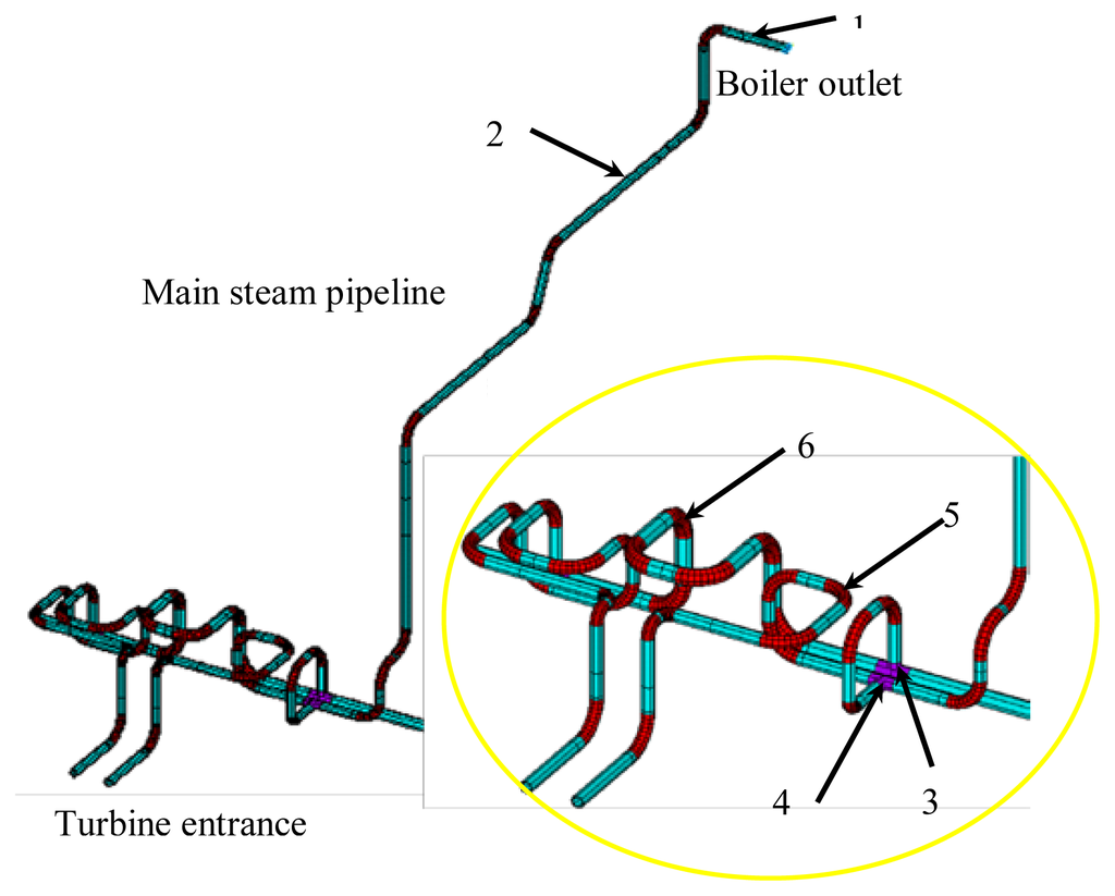 Due to its importance and practical need, the present work focuses on the monitoring of a main steam pipeline. Both the finite element method and engineering experiences are chosen for analysis. During the numerical simulation, piping is selected as shown in Figure 1, which is a part of the main steam piping of a thermal power plant. The working temperature is 540 °C and the pressure is 9.8 MPa. Table 1 shows the material properties and the design parameters of the piping. The dimensions of the main steam piping are 273 mm in diameter, 28 mm in thickness and 1,370 mm in bend radius.