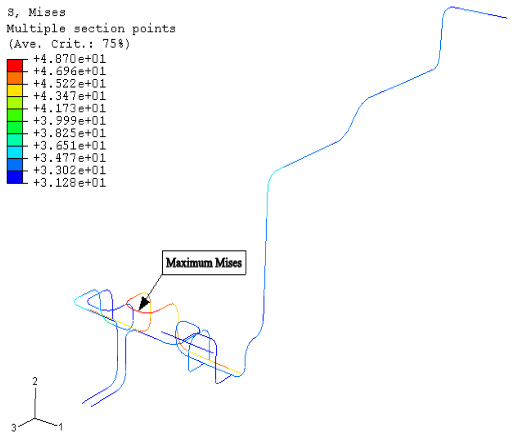 In order to distinguish the “weak” points on the piping system, a von Mises stress contour of the piping system was analyzed using finite element software as shown in Figure 2. The conclusion can be drawn that the maximum stress does not exceed the allowable stress under the working conditions. The higher stress part matches the given location of the design drawings, where the monitoring equipment needs to be installed. The other relatively “weak” parts are bends, and the T-joints. Combining analysis and engineering experiences, the monitoring points are selected as shown in Figure 1. Points 1 and 2 are at the straight pipe near the boiler header. Points 3 and 4 are at weld seams on the T-pipe, and points 5 and 6 were at elbows of the pipe.