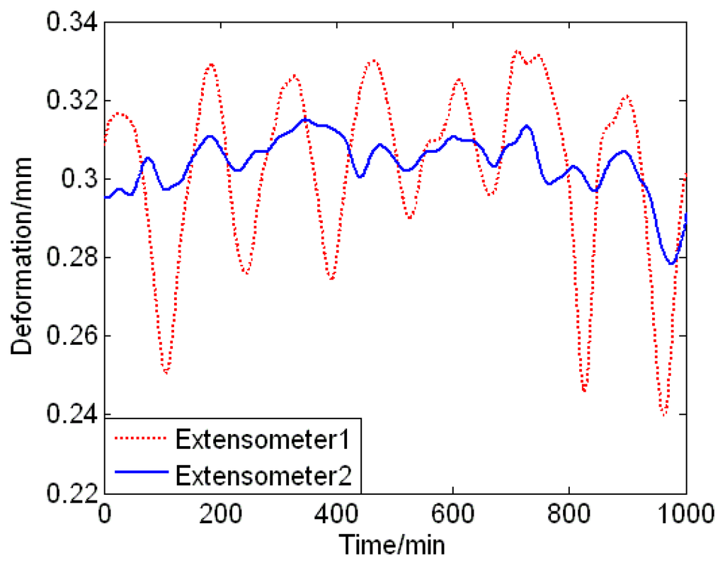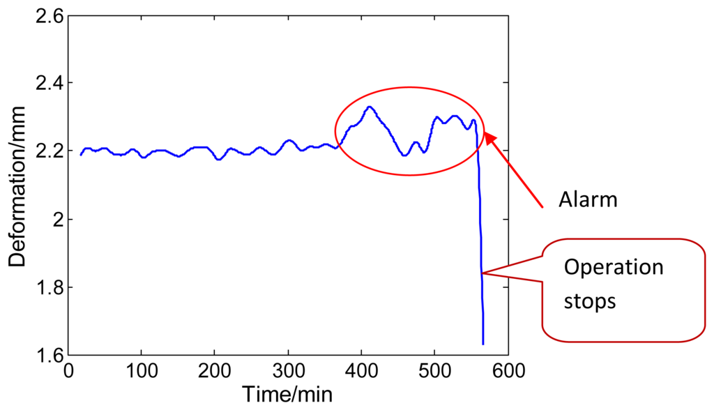 In order to analyze strain changes during alarming, deformation data of the straight pipe for about 560 min before leakage is selected, as shown in Figure 9. This data was recorded by the computer without further processing. According to this figure, it is easy to find that the measuring deformation data of pipe is not a constant. The pressure and the temperature of the steam flowing inside the pipe give rise to this fluctuation during the actual operation of the power plant. Based on fluctuation features of the pipe deformation curve, a rate of deformation of the pipe can be calculated by the least square fitting method. In this system the deformation rate is regarded as the creep rate. The appropriate deformation rate of the pipe can be input into the system's life prediction module in a timely fashion.