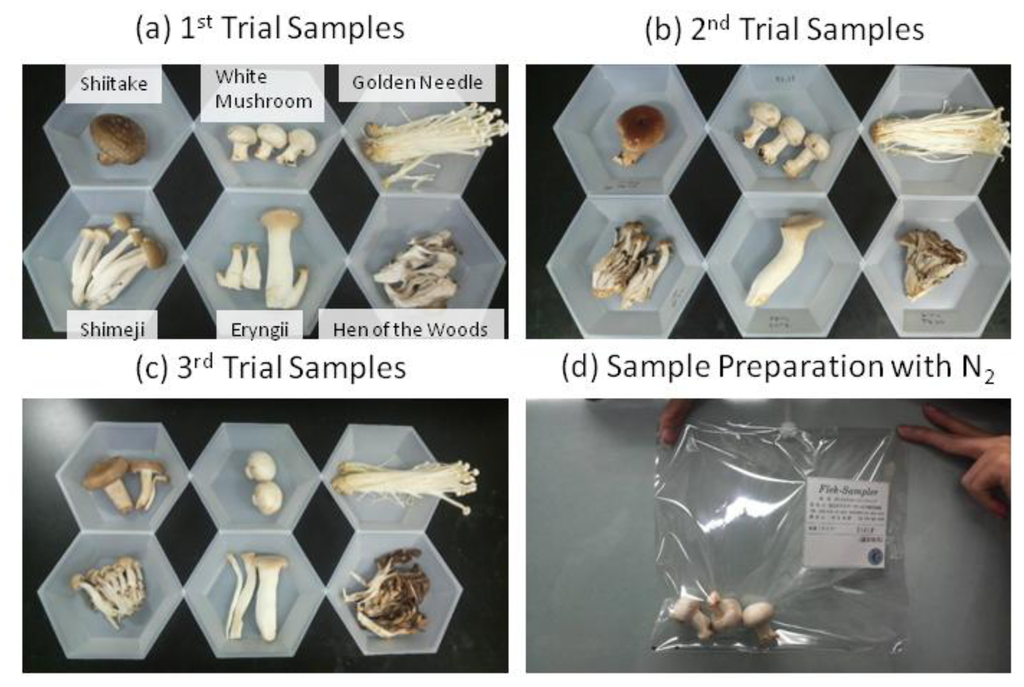 The six fresh mushroom samples (each approximately 30 g) of shiitake, white mushrooms, golden needle, shimeji, eryngii, and hen of the woods, produced in different areas of Japan in each mushroom category, were purchased at retail stores on three different days (Figure 1a–c). After placing these mushrooms into 2 L sample bags (Flek-sampler, Omi Odor-Air Service Corporation, Shiga, Japan), the bags were then filled with dry nitrogen (G1 grade), and allowed to equilibrate for 30 min (generally equilibration was needed for 15–60 min in the 2-L sample bag depending on the smell intensity) with the mushrooms still remaining in the sample bags (Figure 1d). Dry nitrogen was adopted to reduce the interference of moisture.