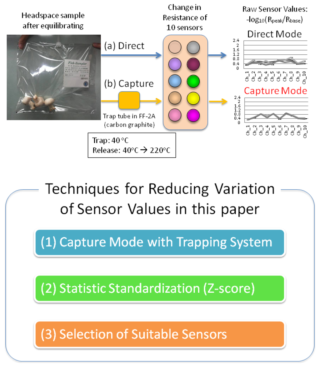 Electronic noses have the benefit of obtaining smell information in a simple and objective manner, therefore, many applications have been developed for broad analysis areas such as food, drinks, cosmetics, medicine, and agriculture. However, measurement values from electronic noses have a tendency to vary under humidity or alcohol exposure conditions, since several types of sensors in the devices are affected by such variables. Consequently, we show three techniques for reducing the variation of sensor values: (1) using a trapping system to reduce the infering components; (2) performing statistical standardization (calculation of z-score); and (3) selecting suitable sensors. With these techniques, we discriminated the volatiles of four types of fresh mushrooms: golden needle (Flammulina velutipes), white mushroom (Agaricus bisporus), shiitake (Lentinus edodes), and eryngii (Pleurotus eryngii) among six fresh mushrooms (hen of the woods (Grifola frondosa), shimeji (Hypsizygus marmoreus) plus the above mushrooms). Additionally, we succeeded in discrimination of white mushroom, only comparing with artificial mushroom flavors, such as champignon flavor and truffle flavor. In conclusion, our techniques will expand the options to reduce variations in sensor values.1. Introduction