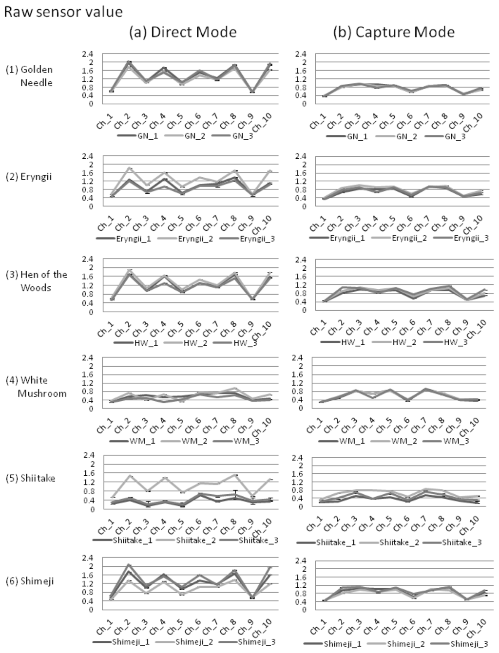 For the sensor values, with the exception of white mushrooms and two varieties of shiitake (shiitake 1 and 3), we observed a tendency in the direct mode to exhibit higher values than capture mode (Figure 3). Also, in the direct mode, even among mushrooms of the same variety, differences greater than 0.8 were observed in the average of the sensor values (eryngii and shiitake).