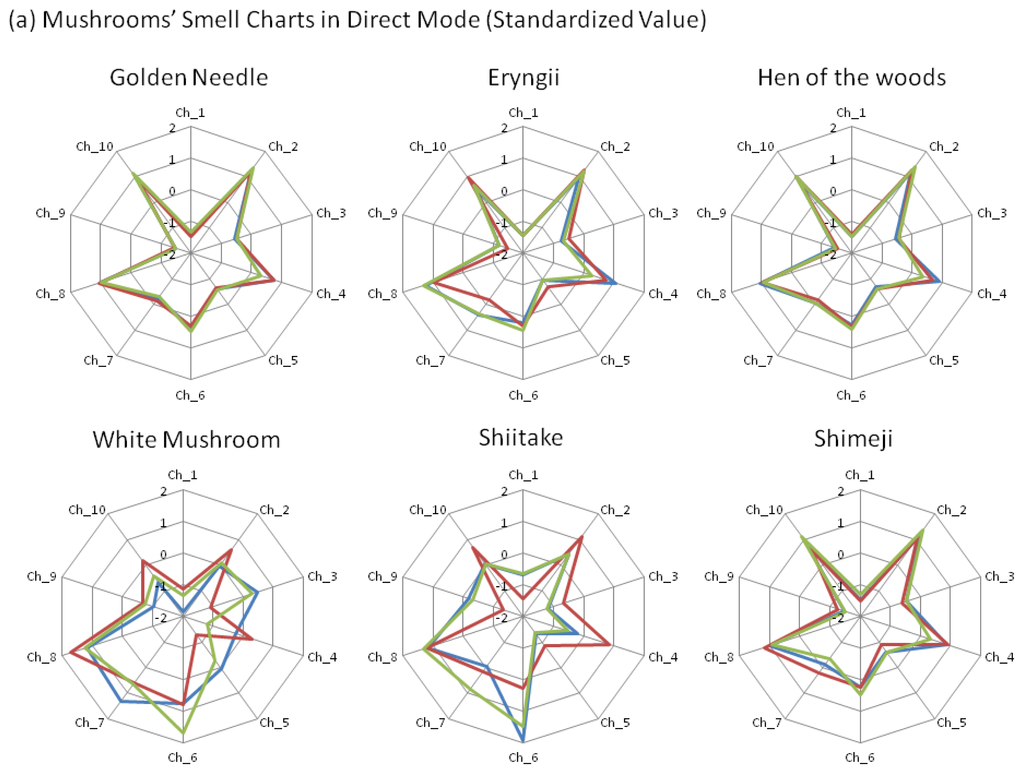 In contrast to our sensor techniques, another study showed the scores about the features of mushrooms with the human senses of smell and taste [37]. This study reported that mushroom-like aromas trigger a negative impression in some consumers; hence, mushrooms that have lower score than other mushrooms have an advantage in the food industry. Additionally, there may be different aroma preferences in Europe and Japan, such as those of shiitake and other such mushrooms aromas [38].