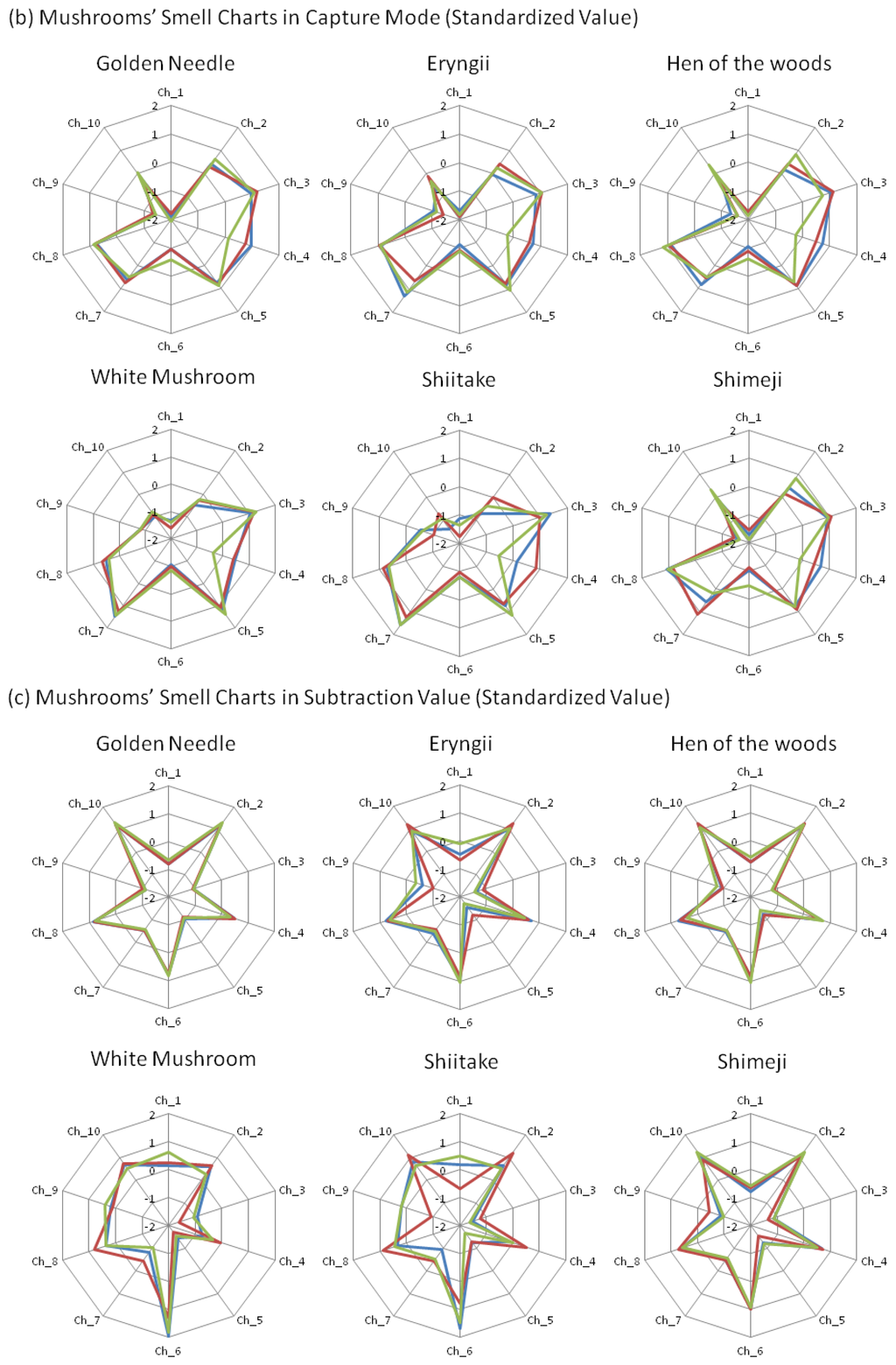 On the other hand, in the direct mode, variations in the z-scores for white mushrooms and shiitake were observed even among mushrooms of the same variety (Figure 4a). For the values obtained by subtraction focusing on the difference in values between the direct mode and capture mode (i.e., differences caused by polar components such as water, alcohol, etc.), golden needle exhibited the characteristics that the z-score of Ch_9 was less than 1 and Ch_10 exceeded 1.2 in subtraction value (Figure 4c).