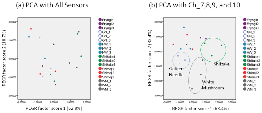 Next, the PCA results obtained from the capture mode values are shown in Figure 6. Although it was not possible to discriminate mushrooms with PCA using all sensor scores (Figure 6a), using the scores of Ch_7–10, it was possible to discriminate golden needles, white mushrooms, and shiitake (Figure 6b).