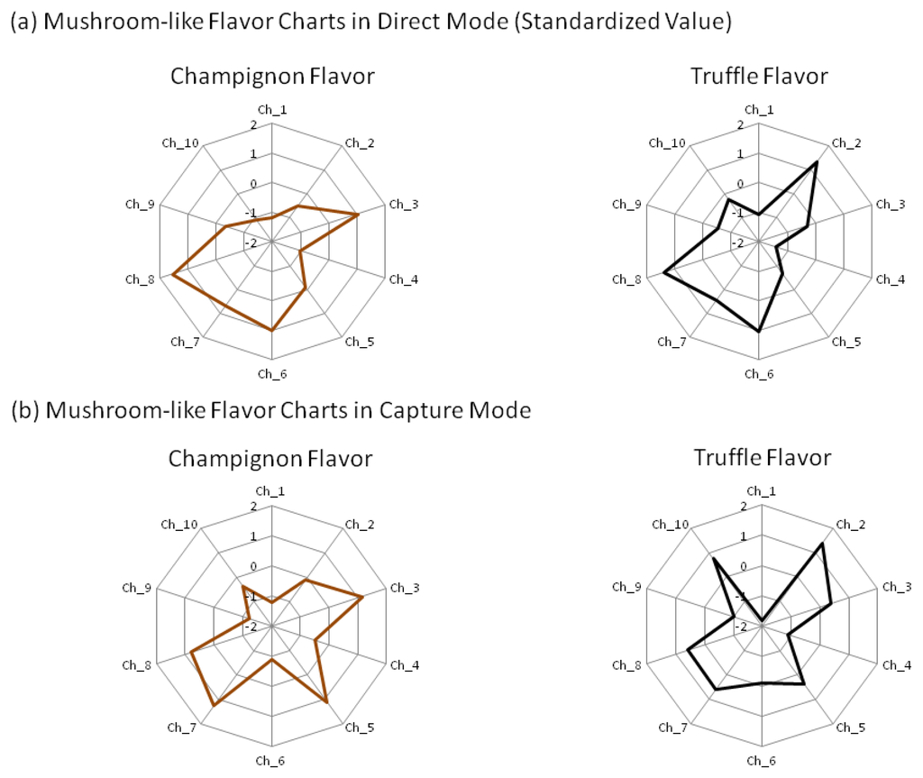 Finally, we investigated the discrimination technique using correlation for two types of artificial mushroom flavors (champignon flavor and truffle flavor). After standardization of the flavors' sensor values (Figure 7), the r for the flavors and mushroom samples was calculated (Table 5).