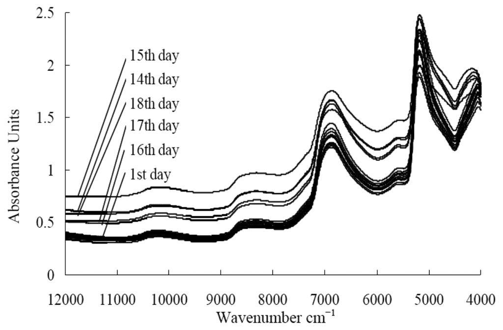 The spectral curves of fresh jujube displayed obvious changes during storage. The absorbance increased with the storage time and it became a clutter during the last four days (Figure 1). The spectral curves for the 14th, 15th and 18th days were out of order due to the rotten jujubes.