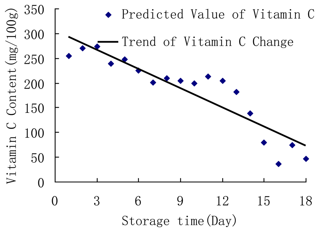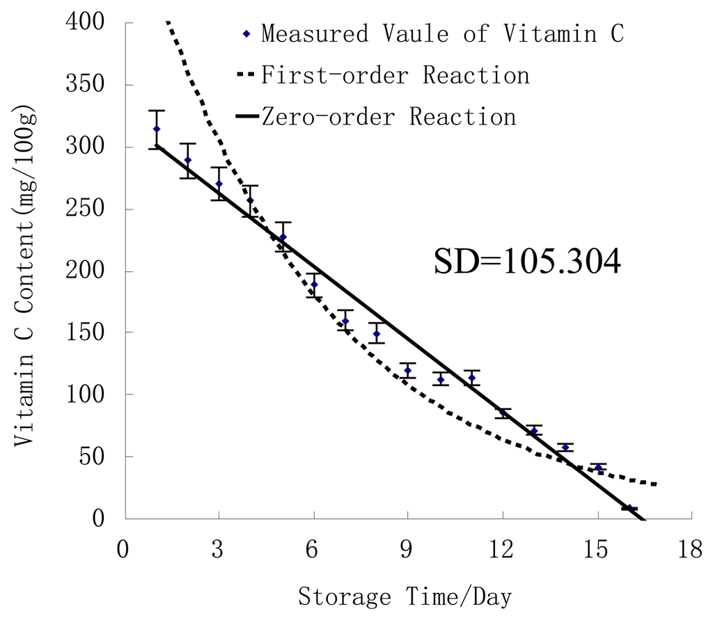 Much research has been reported on the chemical kinetic models of various products during storage, including seafoods, vegetables and juices [–]. Some researchers have developed first-order kinetic models for degradation of vitamin C in juice during storage []. However, there is little information available in the literature about the kinetics of vitamin C content in fresh jujube during storage.