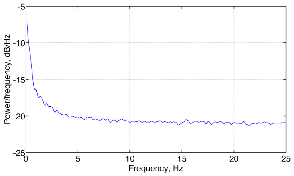 Figure 1 shows a typical portrait of the spectrum of barometric altimeter noise (pressure altitude). The concentration of noise energy in the low frequency region of the spectrum (colored noise) can be explained as the consequence of, e.g., thermal gradients and air flow in the sensor vicinity.