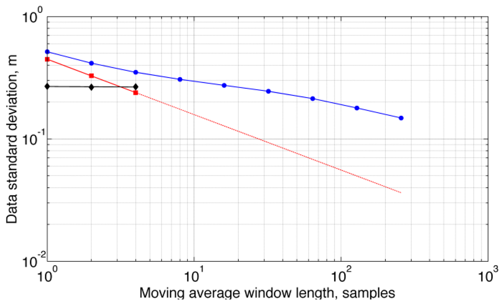 The correlated noise component was virtually unaffected by an M-point moving average filter when M ≥ 4 at a sampling frequency of 50 Hz, and its standard deviation would decrease very slowly for higher values of M, although it was not possible to estimate the ARMA(1,1) model parameters for M ≥ 8, Figure 5. This was due to the fact that data fitting would include the M-point moving average filter itself, which called for higher-order ARMA models. The behavior of the total standard deviation shows that the scaling law, valid for uncorrelated data, is optimistic when dealing with time-correlated data [22]. A noise level of 0.15 cm was reached only when M = 256, which corresponds to an averaging time of about 5 s and a delay of 2.5 s in the filtering chain; on the other hand, M = 32 would suffice to reach a noise level of 0.1 cm if only uncorrelated noise would be present in the barometric altimeter output (however, M = 32 is equivalent to a delay in the filtering chain of 320 ms that can be unacceptably high in several human-centric applications, e.g., pre-impact fall detection [23]).
