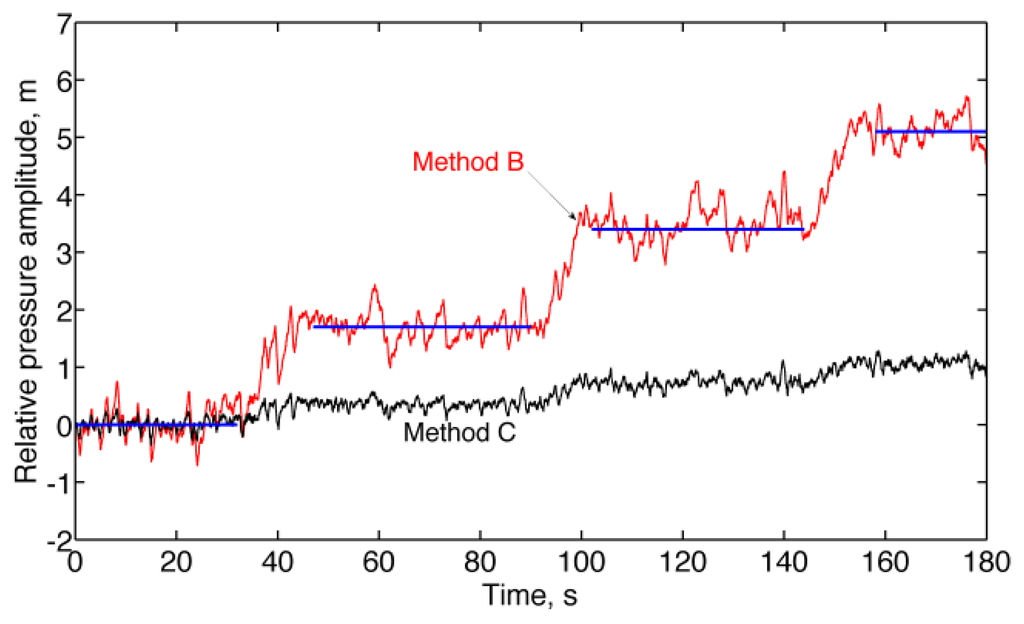 Recent advances in MEMS sensing technologies have led to the availability of barometric altimeters that are well suited for integration in mobile and portable systems. The most popular barometric altimeters for human-centric applications are manufactured by Bosch Sensortec (Reutlingen, Germany) [8–12] and VTI Technologies (Vantaa, Finland) [6,7,9]. These sensors can be used in few measurement modes, which differ in the resolution offered for a given sampling rate. Published recipes for pressure altitude signal conditioning and pre-processing do not go beyond generic prescriptions for low-pass filtering, e.g., in order to obtain an accuracy of 0.1 m using the barometric altimeter alone, several seconds of averaging would be necessary [12].