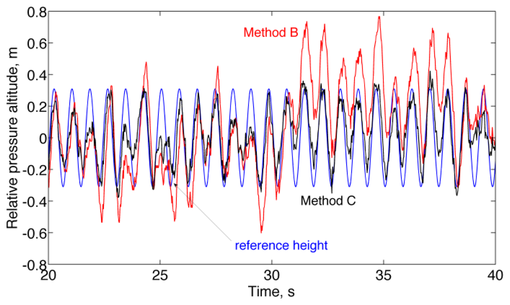 One important result from using the method of analysis developed in this paper is that the generic prescription that several seconds of averaging of barometric altimeter data are necessary to achieve accuracy in the order of 0.1 m is quite misleading. The correlated noise component should be accounted when assessing the benefits of averaging. In all performed static tests, either indoors or outdoors, the correlated noise component turned out to have a greater standard deviation than the uncorrelated noise component, Tables 1 and 2, raising concerns about the suitability of, e.g., moving average filters to reduce altimeter noise.
