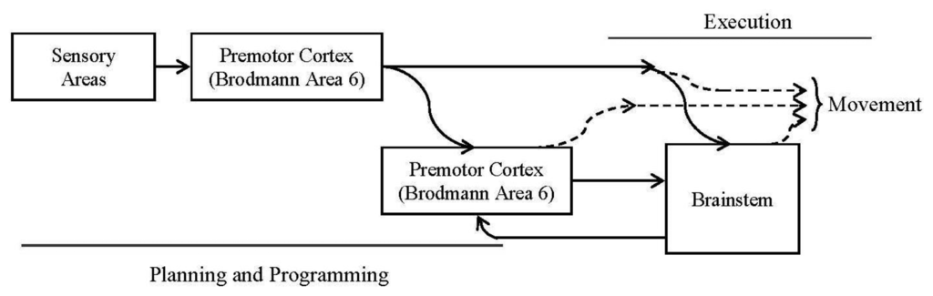 In the sixties, an activity in the primary motor cortex before the movement execution was observed. It was due to a planning of the movement in progress [28]. There is one more subcortical structure type playing an important role in motion control: the basal ganglia [29]. They receive inputs from the neocortex and project to the brainstem controlling the movement in progress. Although they play a role, it is still largely unknown and we have not introduced it in our model.
