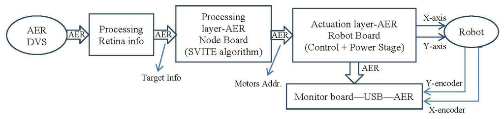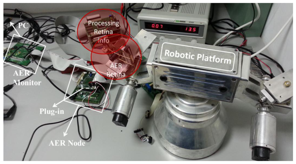 In this section, we are going to use the VITE translation into spikes paradigm to move to several boards to check the algorithm behavior. The setup (Figure 10) consists of two separate parts: the visual perception and the robot actuation. Visual perception is composed of an AER Dynamic Vision Sensor (DVS) retina sensor and its spike-based processing elements for object detection and targeting. These elements are two AER processing layers working in cascade for firstly detecting different objects, and secondly tracking them even with crossing trajectories. Several objects can be detected and targeted in parallel. The maximum number of parallel objects to be processed depends on the FPGA available resources. For a Spartan II 200 FPGA from Xilinx up the maximum are four objects. The first layer starts “seeing” the complete visual field from the DVS for all the parallel object detectors. When an object is detected, the mass center is used to close the visual field to be observed in order to track only this detected object. The tracking process is done by a cascade spike-based processor and it offers also the speed. The output of the system offers not only the center position of the tracked object but also the speed in pixels per second. The system is fully hardware implemented on FPGA (Spartan II 200) [24].