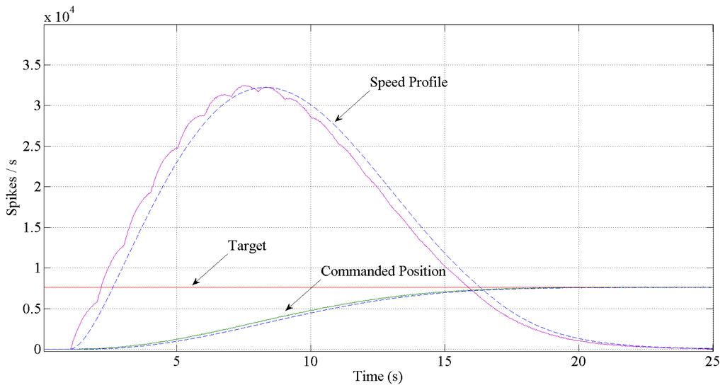 Turning to the slower trajectory and looking at it, the x-axis gets the position commanded in approximately one second and then starts the movement in the y-axis. If we compare the theoretical signal delivered to the motors (Figure 13) and the movement achieved (reads out from the encoders of the motors and using jAERsoftware tool [38]) shown in Figure 17, it reveals a couple of comments regarding time reaching length. For the x-axis, the one commanded by the speed profile, it is quite different, but in both cases, they have the same maximum firing rate and for the y-axis, commanded by the position, we found nearly the same length. The reason for the difference at time length in the x-axis can be understood with these two points: non-feedback used, which means once the motor starts running we do not have any inertia control, non-feedback from any sensor.
