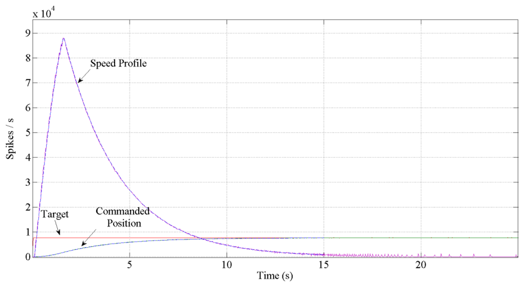 Once the stability of the system has been shown, some aspects must be mentioned. There is a big difference between the classical continuous signals and these spike-based systems: the idle state as we understand it (zero value for a signal) does not exist in a spike system [34]. In our system we have an element (Hold and Fire) where a spike comparison is performed with a temporal window to decide whether to fire a spike or not; the joint of this element with the other integrators and generators can cause a spurious minimum firing rate. For example, we could be considering an idle state if there were a firing rate of one spike per hour and it was not completely true. This fact can be understood as a white Gaussian noise. Nevertheless, to avoid this noise effect, the GO signal has a temporal life ensuring non added spikes to the reference. This temporal validity of the GO signal could also provoke a non-reaching if its effect is not enough. A tradeoff between the stability of the system and successful reaching is established.