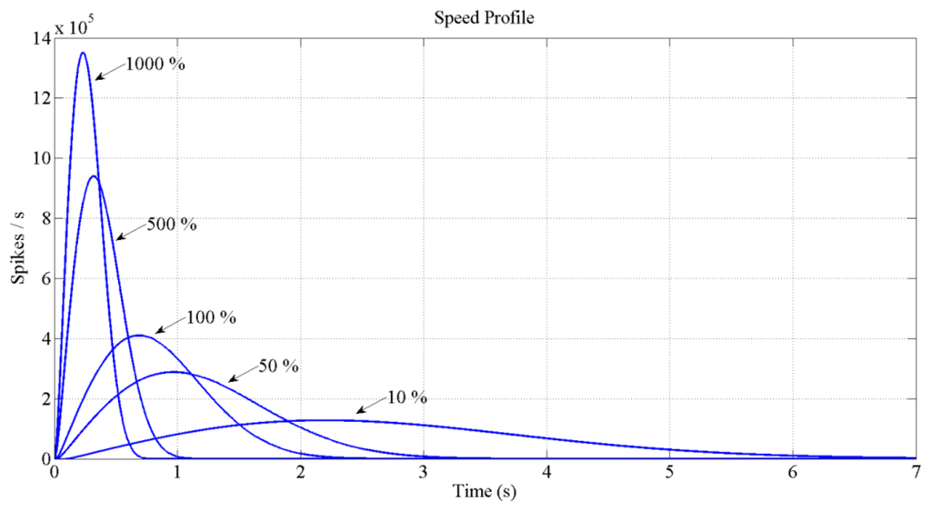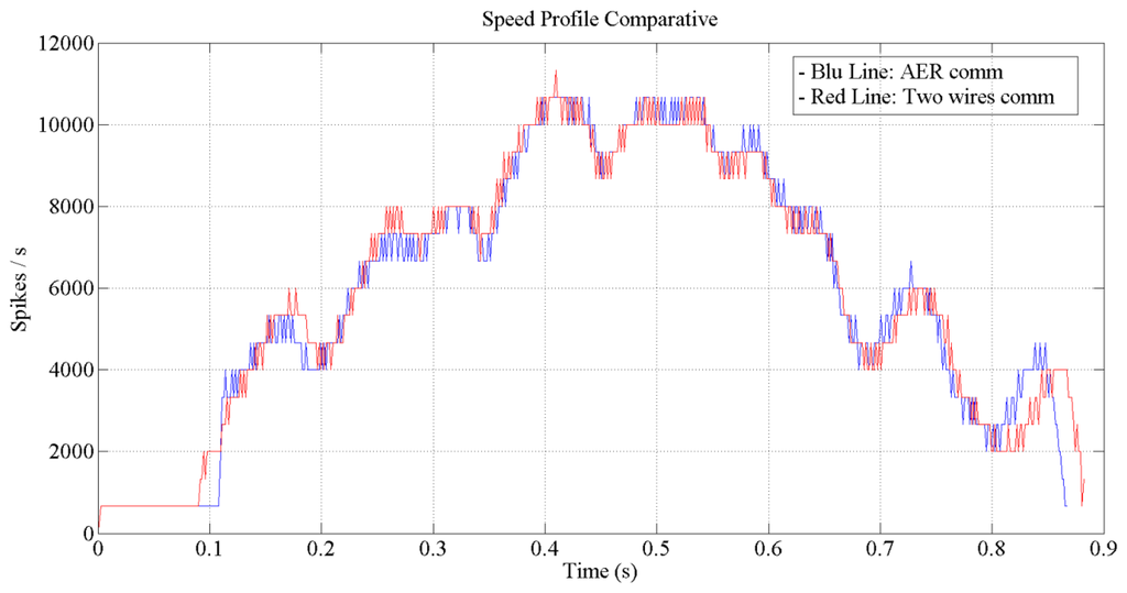 Figures 12 and 13 show the expected behavior of the algorithm translated into spikes paradigm against the behavior of the original design of the algorithm by Grossberg. The dotted lines are taken from simulations of the original VITE algorithm; solid lines show the same data but measured in the boards with a special AER monitor [36,37]. The speed profile is taken before the integer block (the Integrate and Generate block in Figure 5) and the position orders at the output. The accuracy for both signals is highly precise and it suggests the opportunity of succeeding with a fully spike-based robot controller. Figure 14 shows simulation data for the speed profile achievable when the parameter slope_counter in GO block goes through different values causing 10, 50, 100, 500 and 1000 percentage slopes. The bell shape profiles confirm the studies in [27] where it is said that as faster is the movement the higher asymmetric speed profiles are performed. At the description of the layers we presented two options for the communication between both: AER communication or just a pair of wires carrying the spikes. In Figure 15, both options are shown regarding speed profile. This graph does not reveal any change at the firing rate when an AER communication is applied between the layers. This fact allows us to say that AER communication is a good strategy to connect spike-based processing and actuation without any modification in the spiking rate transmissions. These two tests concern only the x-axis which is the one fed by the speed profile. The slope used was 10%.