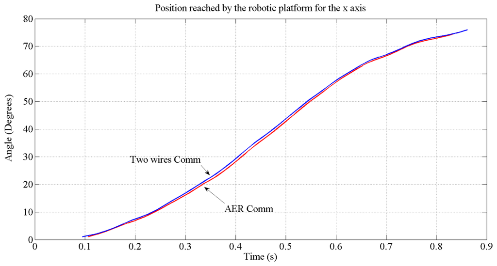 In Figure 16, the position (angle) reached for each type of communication is shown. The reference ordered for this movement was 75 degrees. As we can see, with both types of transmission, the target will be reached by the platform. The blue line represents the position reached when a two wires communication is performed and the red line represents the position reached when an AER communication is used. The tiny difference between both communication modes are due to the fact that within AER, a handshake took place to access the bus. The test also reveals a maximum speed of 83 degrees per second on the x-axis.