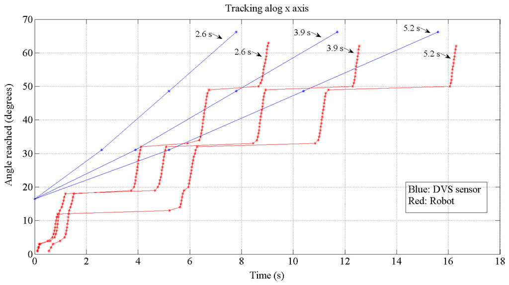 Thus, in Figure 18 we have performed a real test to check the tracking properties of the robot. The test is done just for the x-axis which is the one commanded by the speed profile. The angle fed by the retina is calculated using jAER. For these tests, the target has been delivered to the processing layer by DVS sensor with three difference time distances: 2.6, 3.9 and 5.2 s for each one. It is possible to detect the latency of 0.1 s at the beginning. The processing time can also be calculated by computing the time between the target delivery and the start of the motion minus the fixed latency. It results 0.5 s.