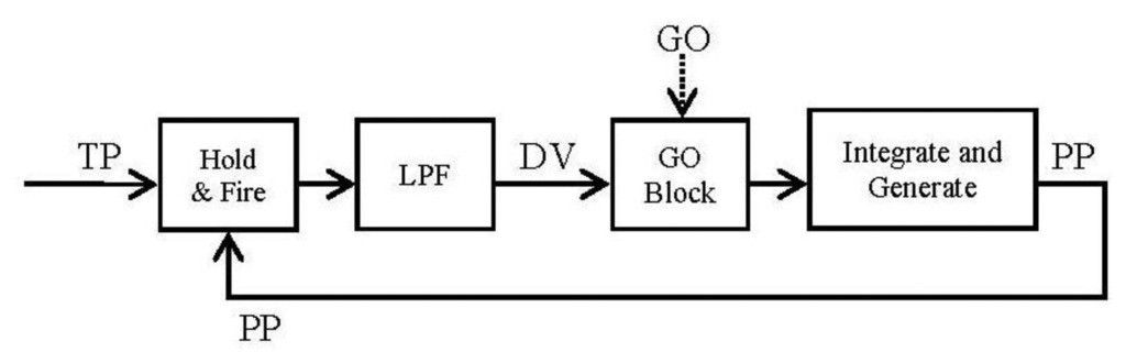 Therefore, taking the equations of the algorithm as our starting-point and using the Laplace transformation to solve the equations, the main parts of the algorithm are translated regardless of whether the GO signal is used, because if we translate the equations in a strict way, the product between GO signal and the difference vector will be translated into a convolution in the frequency-domain and it will not be correct because this GO signal was designed in order to control the speed of the movement in the original algorithm. With this argument and regarding the information inside a spike system, the translation into spike paradigm for this product will be an addition of two spike trains in the spikes-processing paradigm. As a result, the firing rate (or frequency) of the resulting signal will be increased in any case. The next section deals with this idea. Thus, the translation, starting with Equations (1) and (2), is as follows: