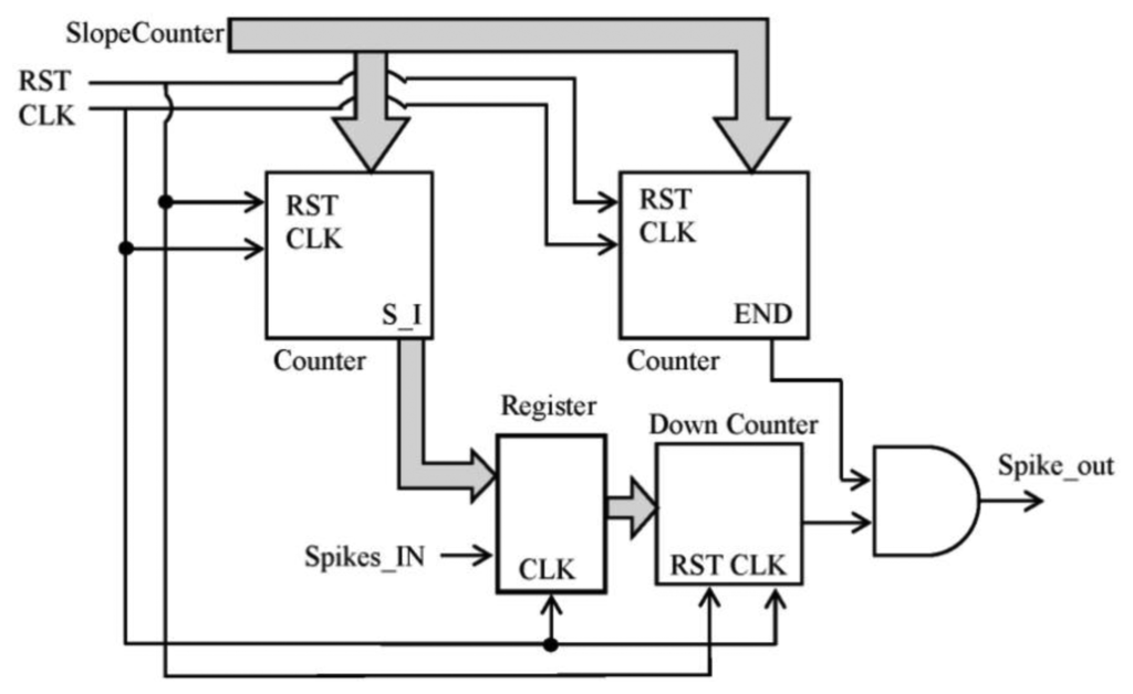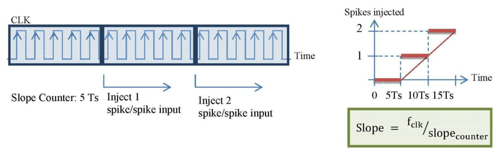 The straight counters receive the slope_counter parameter and produce the number of spikes according to the slope value of the ramp and the signal to finish the spike injection, respectively. Every time that a spike is received, the register value is updated with the number of spikes to inject. Figure 7 shows the behavior explained.