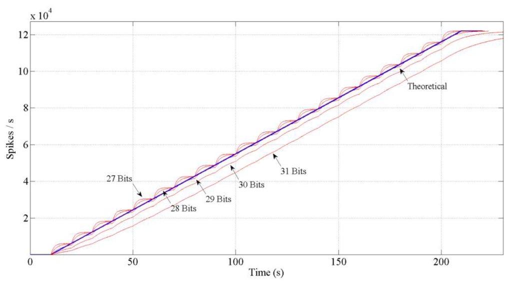 If we design the block as it has been explained, the red thicker line behavior in Figure 7 would be performed. It is a discrete result. A logical conclusion if we consider the spike systems: to inject or not a spike. Then, to reach the continuous solution (thinner line) it is necessary to include a low pass filter (spike-based and with single gain, too) at the output in the block diagram. This filter will distribute the spikes uniformly. However, including this filter involves a problem: the spikes low pass filter includes an “integrate and generate” (also spike-based) [31] at its output. This I & G block keeps an n-bits count for the incoming spikes and generates spikes according to that count. So, we have to avoid the overflow of the count. Thus, we should finely tune it in order to avoid the saturation of the whole system. Figure 8 shows different bits implementations for the integer.