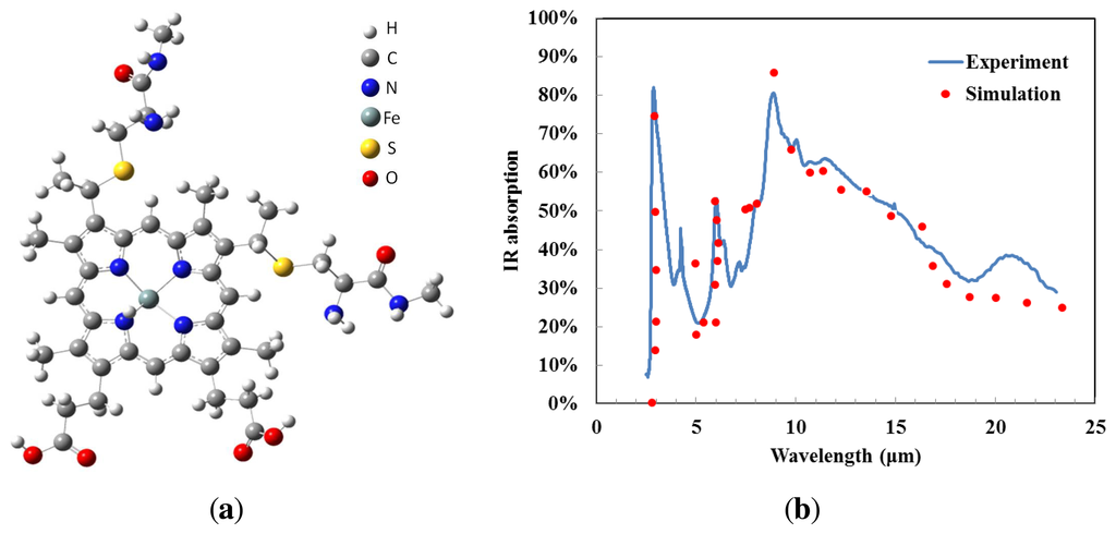 Gaussian® and GaussView® are examples of electronic structure modeling software, and were used to simulate the expected infrared absorption spectrum of cytochrome c. It is assumed that electromagnetic radiation is absorbed due to molecular vibration; therefore, the molecular structure of cytochrome c must be investigated. We used the molecule building module in GaussView® to create the 3D molecular structure, as shown in Figure 1a. Gaussian® approximates orbital shapes and orbital energies of a given molecular geometry using model chemistry. We selected the Hartree-Fock method to perform our frequency analysis. The vibrational frequencies and infrared spectra of the molecule were displayed by GaussView® after the Gaussian® run completed, resulting in the vibrational frequency calculation shown as dots in Figure 1b. When molecular vibrations corresponded to a certain frequency, infrared radiation was absorbed. Due to the complicated nature of the molecular structure of cytochrome c the infrared absorption simulation results showed multiple absorption wavelengths. The IR absorption of cytochrome c is relatively high in the regions 3 μm and 5–11 μm. There are numerous molecular vibrational modes. Cytochrome c shows good absorption due to C–C bonds, C–O bonds and C–N bonds [13], and no additional material is required to enhance absorption for infrared spectral bands. This makes cytochrome c protein a promising material for uncooled thermal detectors.
