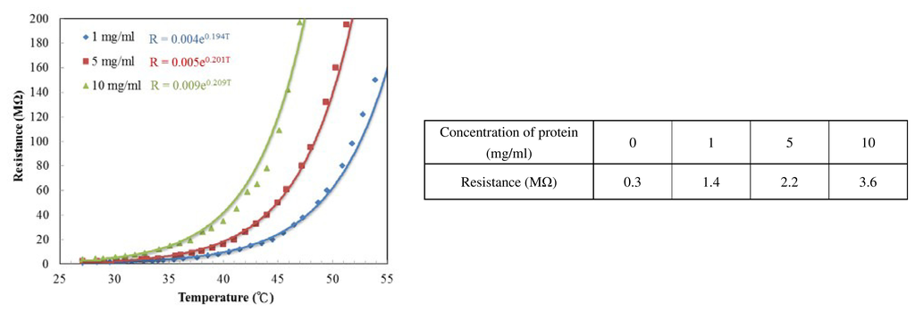 In order to make the IR sensing thin film, the cytochrome c must be dissolved into liquid and then spin-coated. However, when the cytochrome c is dissolved in deionized (DI) water, the resistance is too large to measure. We require a phosphate buffer solution in addition to DI water. The phosphate buffer solutions are commonly used in biological research. The resistances of different ratios of cytochrome c to phosphate buffer solution are shown in Figure 10. Omission of the cytochrome c protein powder results in the resistivity of the thin film (mainly potassium phosphate buffer solution) reducing to 0.3 MΩ. As more protein is added the resistance increased. Therefore, the phosphate buffer solution improves conductivity of the cytochrome c thin film. Figure 10 shows the experimental results, with TCR values corresponding to 19.4, 20.1 and 20.9%/K for protein concentrations of 1, 5 and 10 mg/mL, respectively. The higher the ratio of cytochrome c, the more sensitive the resistance is to temperature change. We conclude that the potassium phosphate electrolyte was responsible for conductivity for the film, while the cytochrome c protein accounts for the resistance change over temperature. It was also possible that the cracks in Figure 9b are a result of crystallization of the phosphate due to water evaporation.